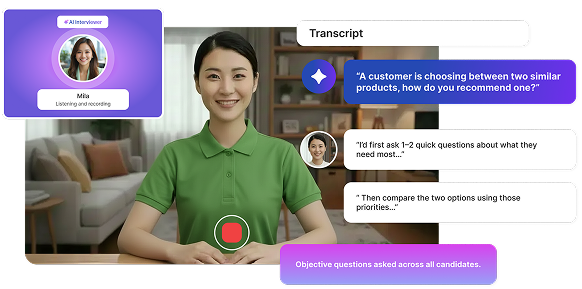 Managers receive a short summary of strengths and watch-outs, plus the transcript and recording of responses. They use it to decide who to move forward and what to probe next, without repeating first-round questions.