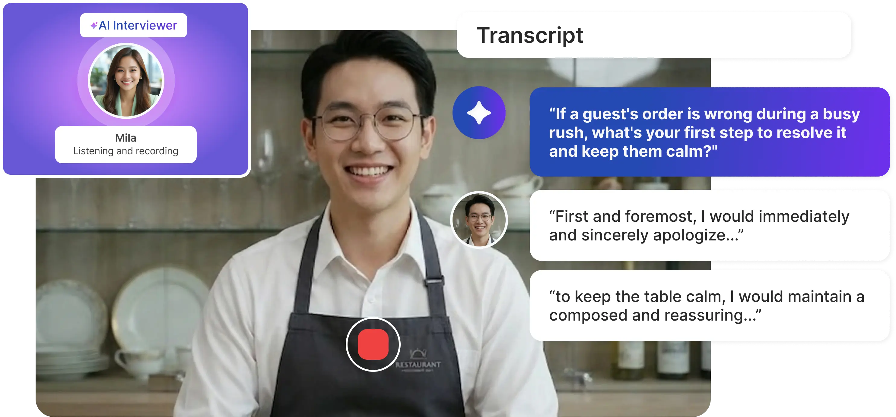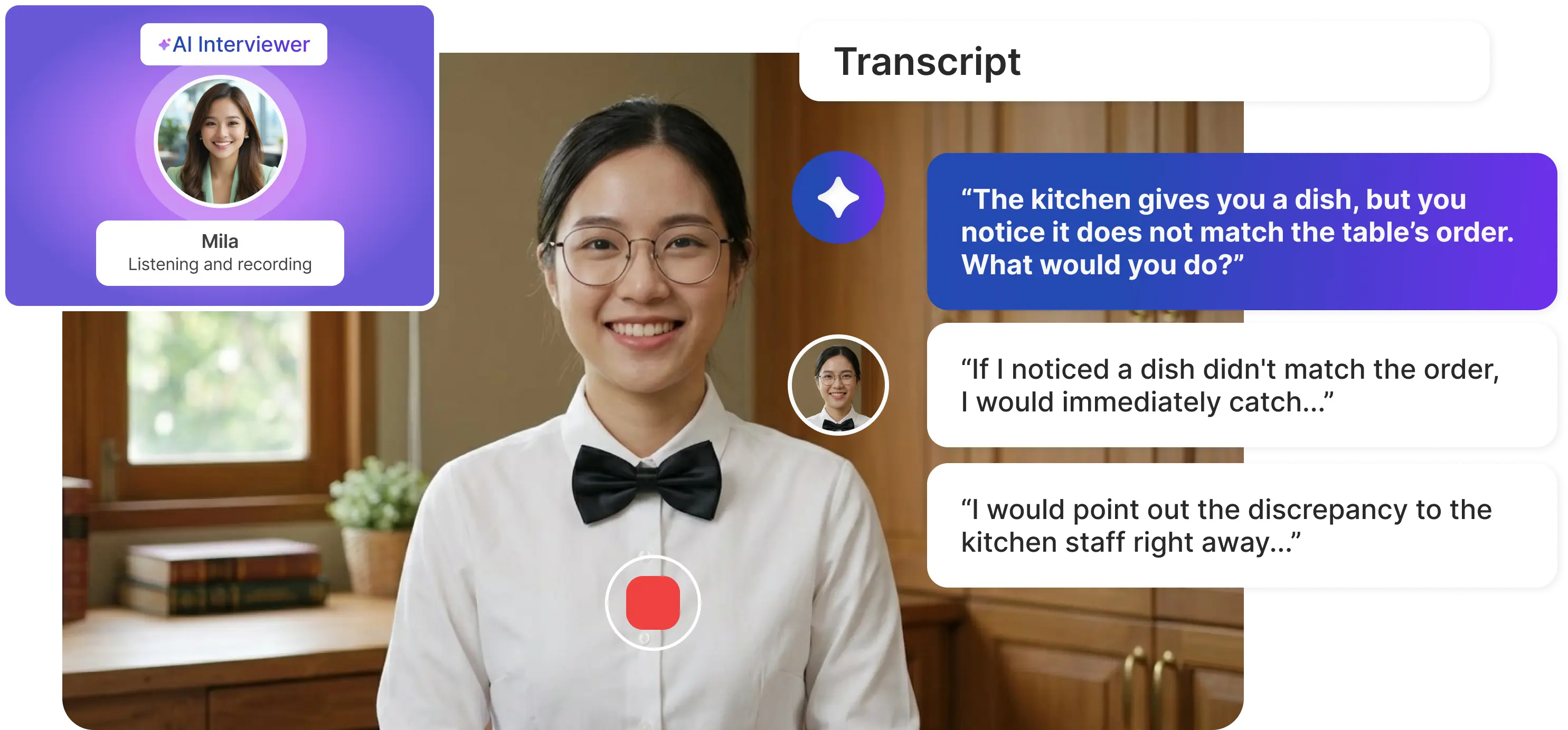 A full transcript and recording of how the candidate answered waiter-specific scenario questions.
