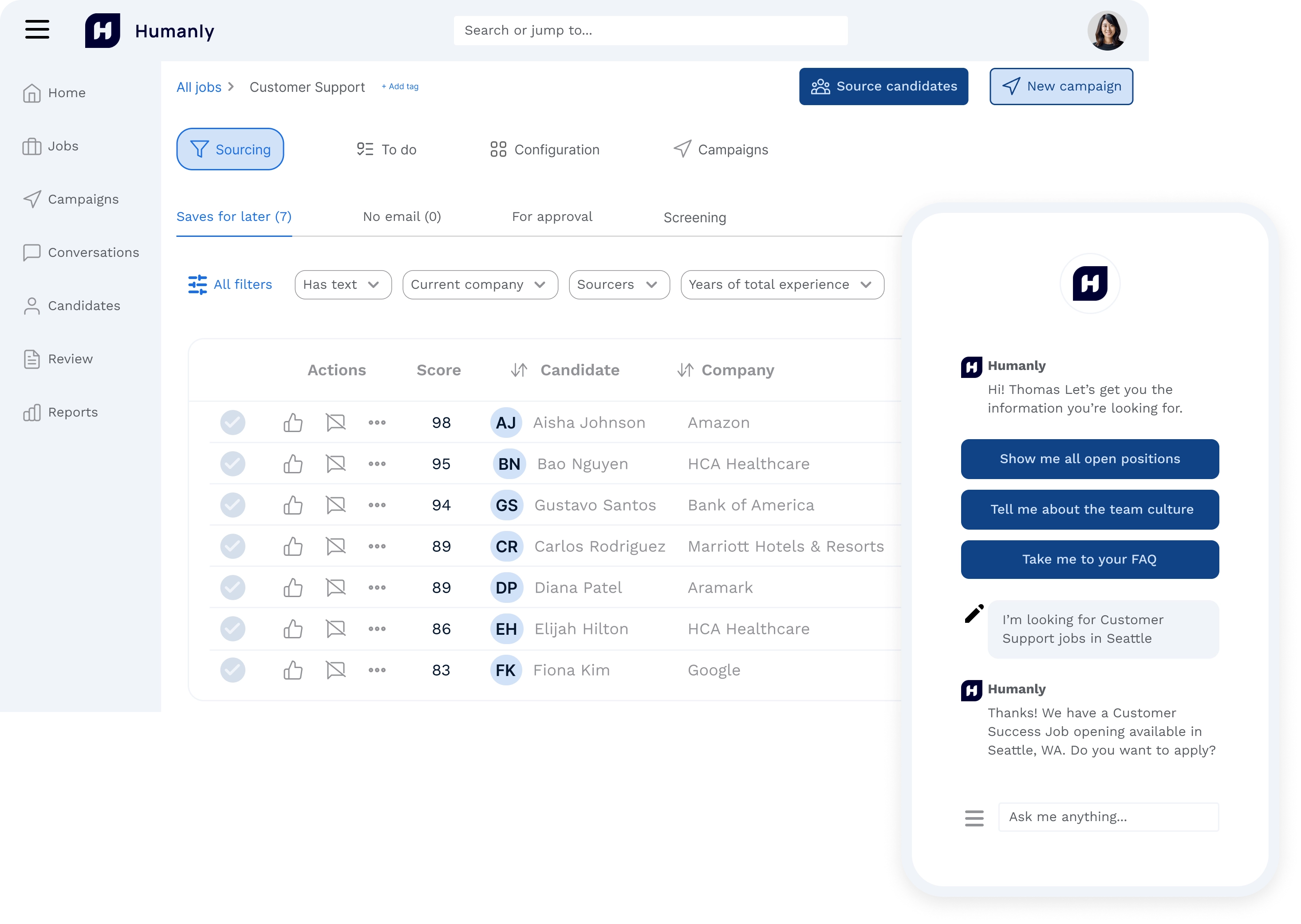 Recruiters using Humanly see faster handling of large candidate flows. They also get better visibility into their hiring funnel and maintain consistency in how candidates are treated.