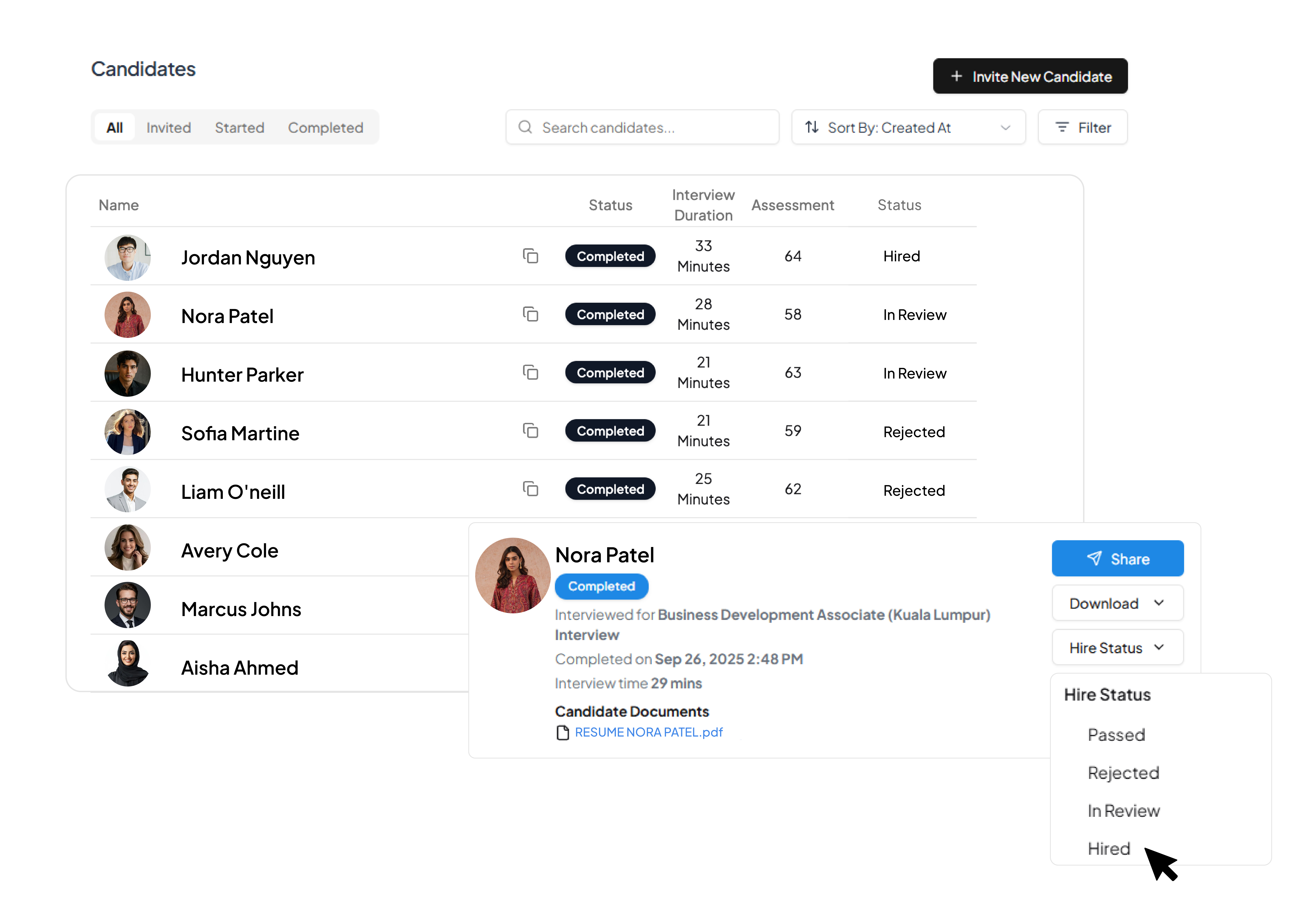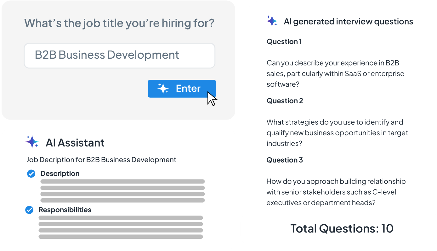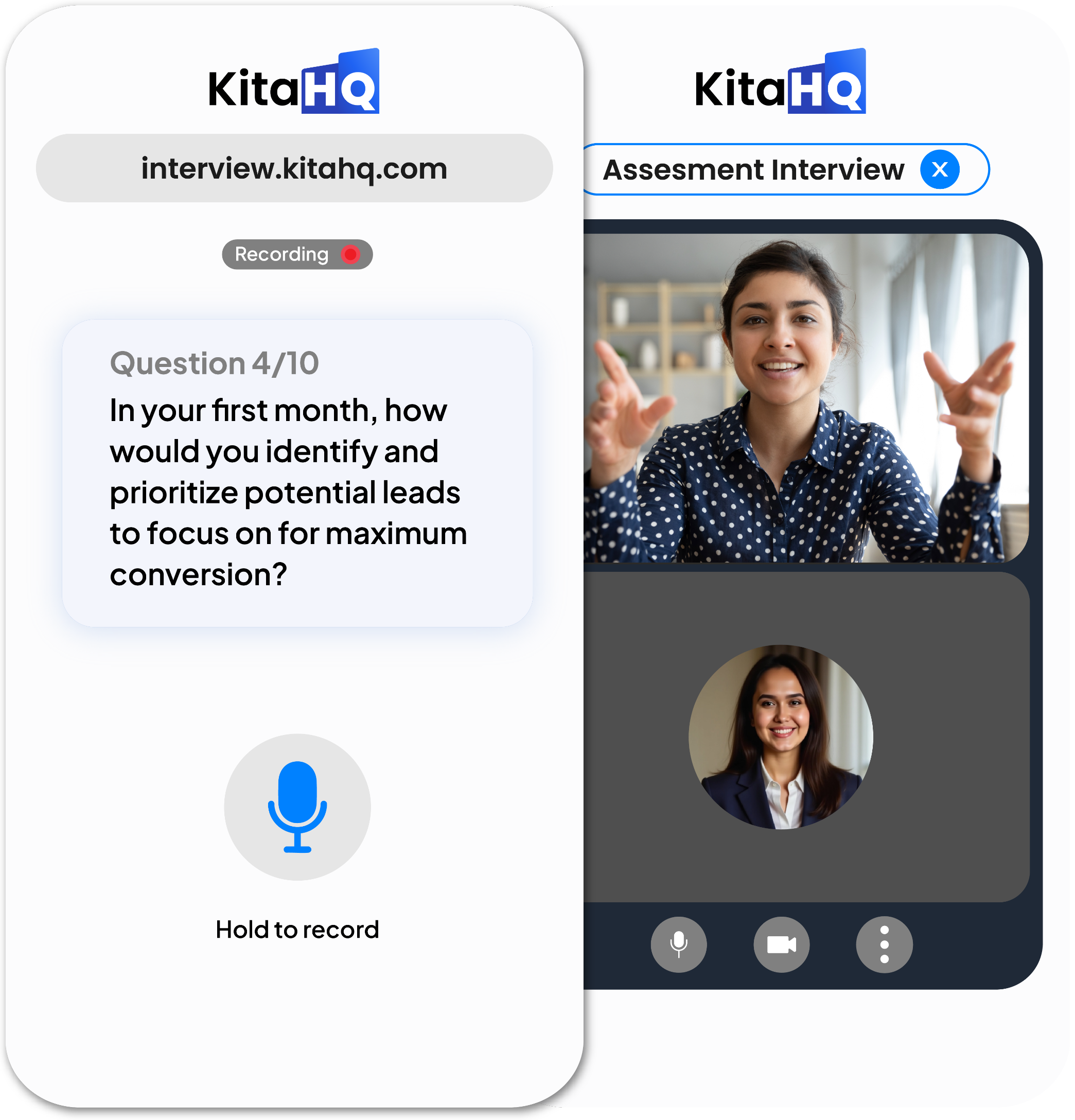 An AI video interview platform (also known as an asynchronous video interview) is a hiring solution where candidates record responses to pre-set questions, instead of meeting recruiters live. With KitaHQ, this process is enhanced through AI-based interview features, automated scheduling, and structured interviewing, helping businesses hire faster, fairer, and at scale.
